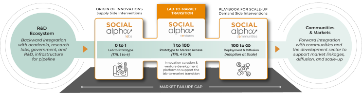 Social Alpha has been designed as a multistage innovation curation and venture development platform for science and technology start-ups that aim to address the most critical social, economic and environmental challenges. The Social Alpha architecture enables us to transition innovations from lab to market to communities by aligning the incentives of Society, Markets and State. Since its inception in 2016, Social Alpha has nurtured over 300 start-ups, including 100+ catalytic grants and 80+ seed investments.